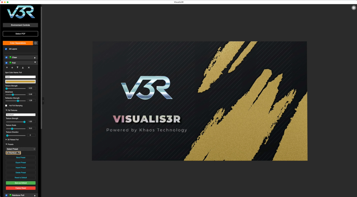 Watch how Visualis3R transforms your design process. Our tutorial videos are created to showcase the power of real-time embellishment simulation, covering all features of a specific embelishment—featuring cold foil, hot foil stamping, neon colors, and more. Discover how easy it is to create, preview, and share professional-grade visuals.